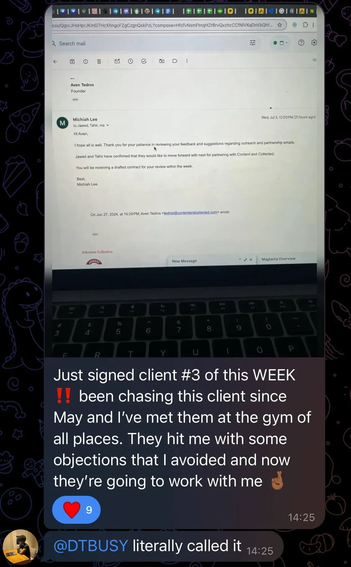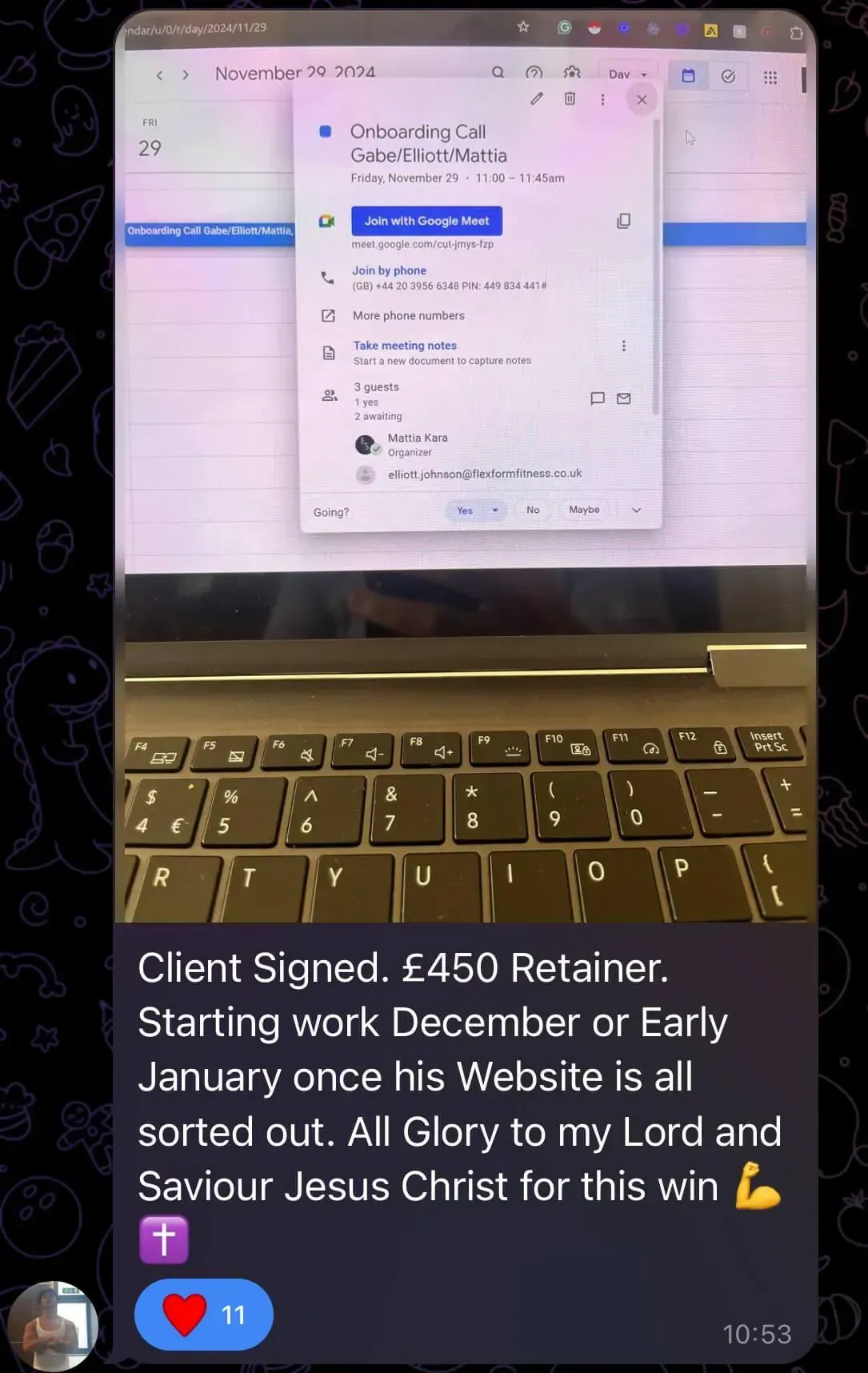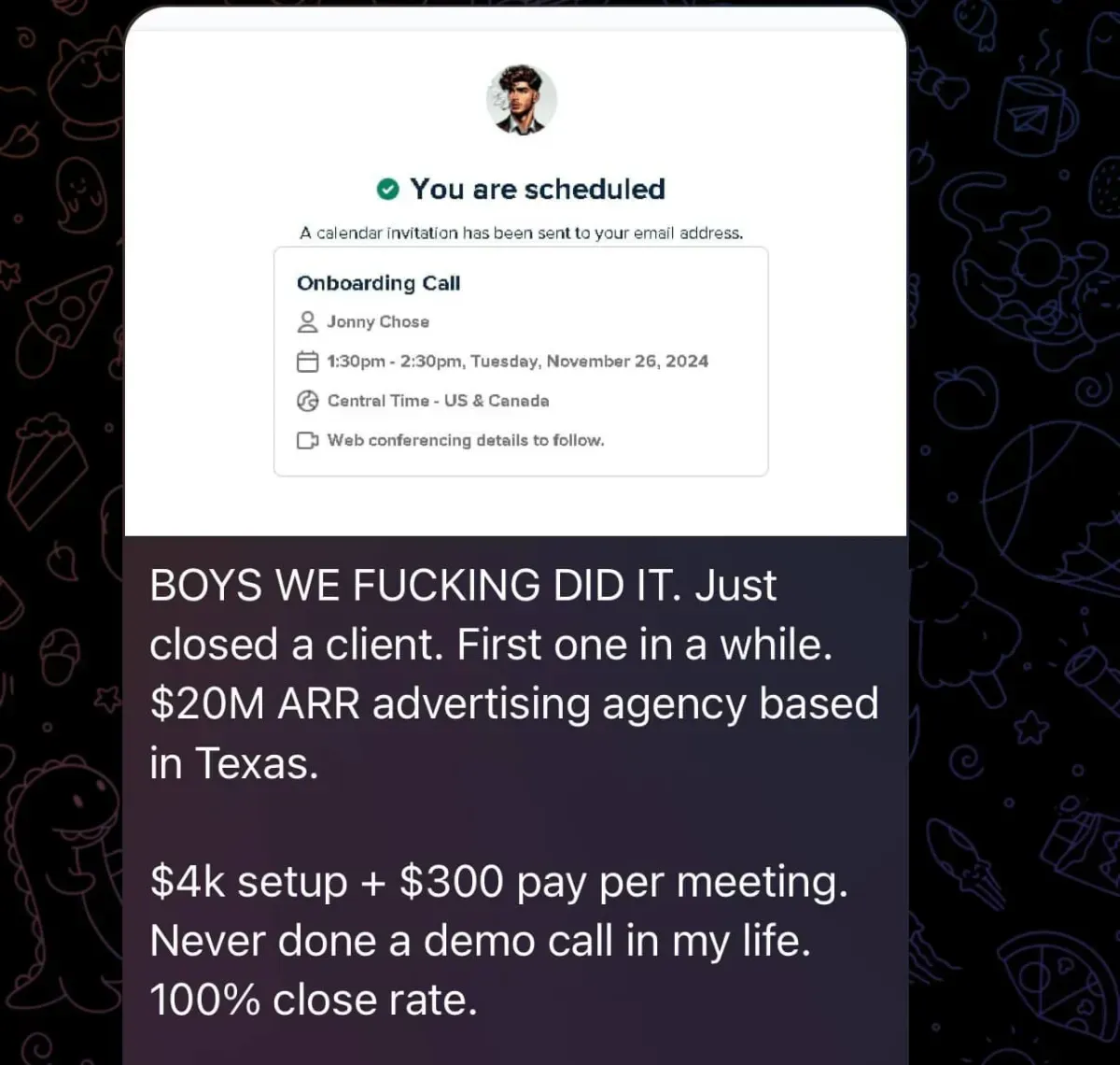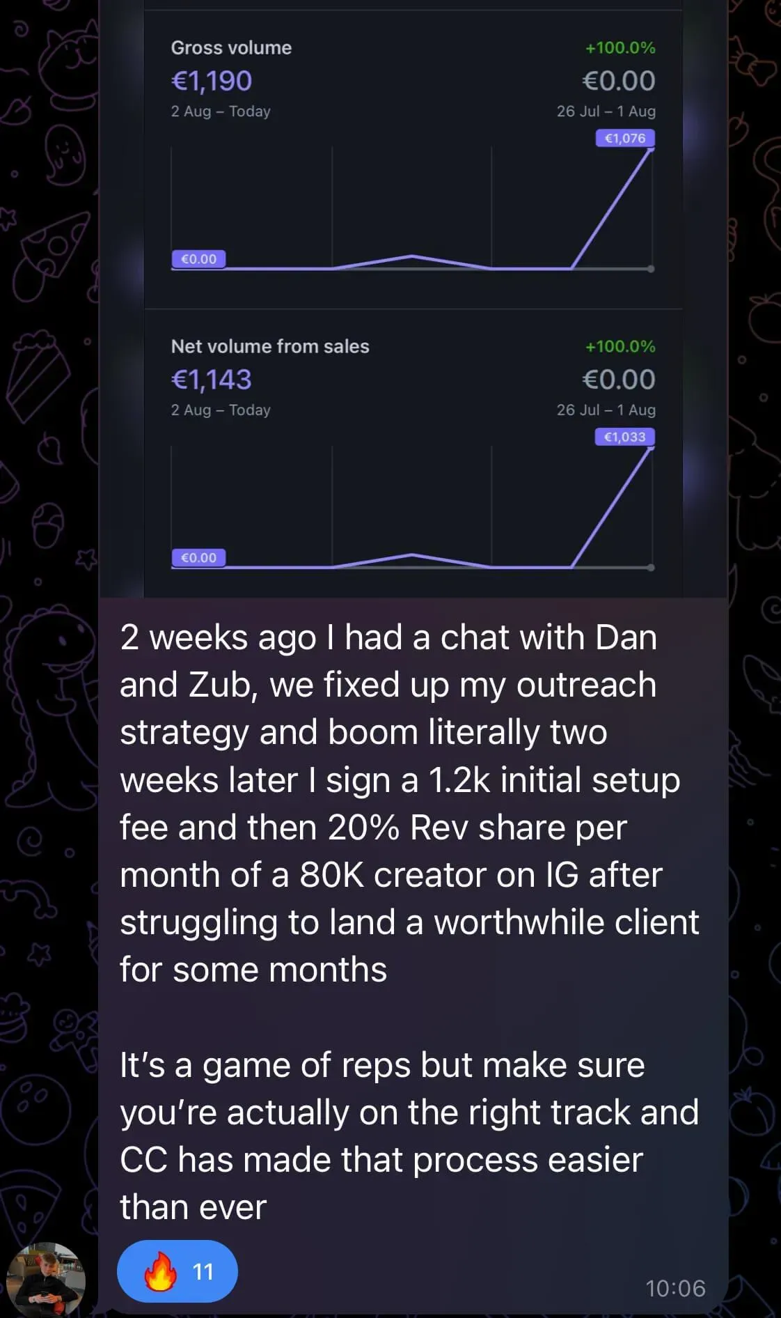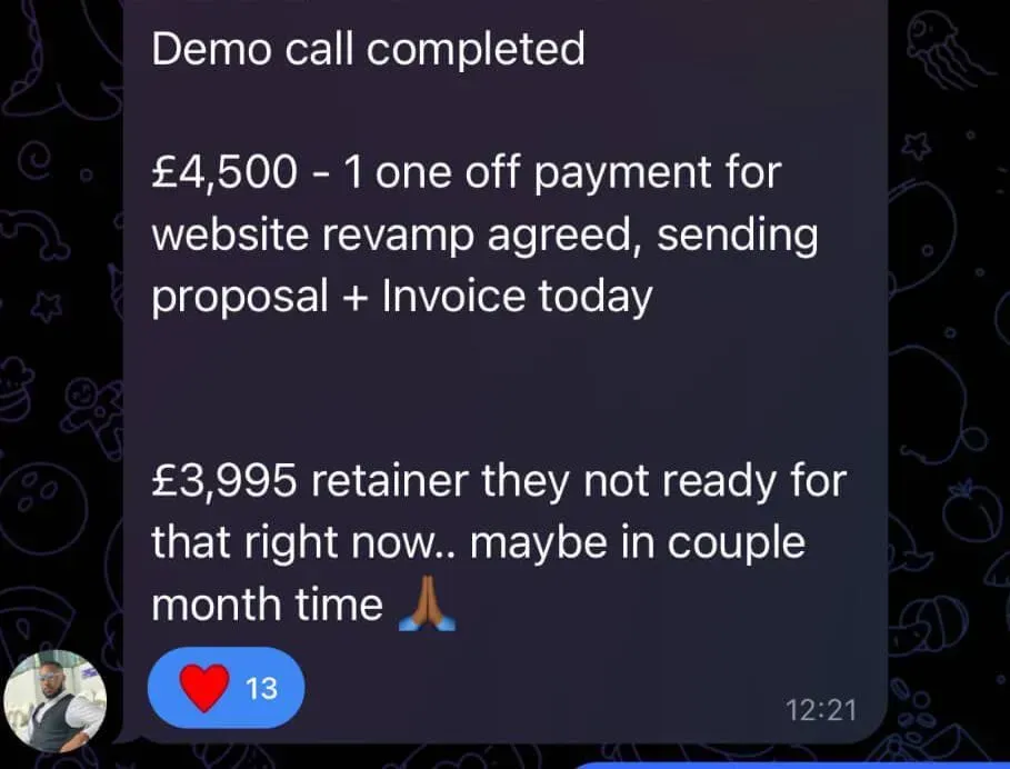 Was at uni, tried multiple online business models, struggled for months, and only signed his first client when financial pressure forced him to focus (overdraft/credit card situation). He joined a networking group, met people connected to Dan, and eventually partnered with him - bringing more systems/automation thinking to balance Dan’s pure sales intensity. Both together have generated over 7-figures with their agency
